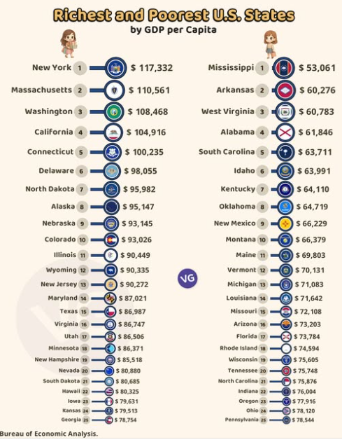 We’re all seen graphics that remind us that blue states tend to be far wealthier that red states; one of which is at the left.  Note that all the wealthiest top six states voted for Harris in 2024, and all the poorest eight voted for Trump.