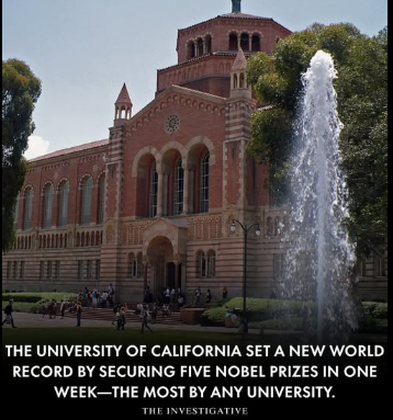 I bring this up because of the recent announcement (see above) that the University of California, with its 10 campuses, won five Nobel Prizes recently. UC Santa Barbara alone has 11 Nobel laureates, nine of which are in physics and materials science. That’s a lot of intelligence floating around in a city whose population is only about 89,000.
